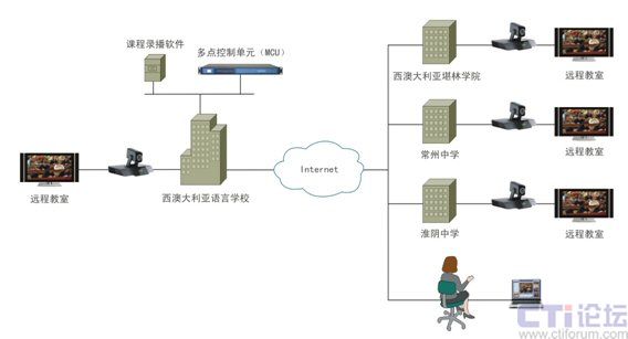 中澳遠程教育系統采用科達KDV8000C多點控制單元(MCU)1臺和課程錄播軟件1套安裝在西澳大利亞語言學院,4臺TS6610視頻會議終端,分別安裝在西澳語言學院、堪林學院、常州中學和淮陰中學的遠程教室。此外,考慮到遠程授課的實際應用需求,系統還提供了無線麥克接入方案。系統部署拓撲圖見下圖。