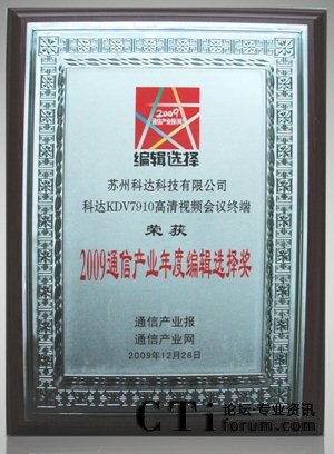 CTI論壇(ctiforum)3月5日消息(記者 潘婷):日前,為了表彰在技術和服務領域為通信產業(yè)創(chuàng)造巨大價值的產品和企業(yè),通信產業(yè)報(網)推出2009年度“編輯選擇獎”評選活動,KDV7910高清視頻會議終端以其出色的視音頻效果、強大的會議功能、優(yōu)秀的網絡適應性和電信級安全可靠性榮獲該獎項。