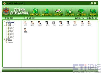 如圖所示的畫面即為網(wǎng)動協(xié)同辦公系統(tǒng)的基礎(chǔ)工具——協(xié)同通訊系統(tǒng),該系統(tǒng)可將部隊機構(gòu)內(nèi)的所有部門、人員按照實際的組織結(jié)構(gòu)列出,應(yīng)用該系統(tǒng)的人員通過點擊其他在線人員,從而有選擇性的與對方進行語音、視頻、數(shù)據(jù)共享、點對點會議等各種操作,將以往“看不見”的對話變?yōu)椤懊鎸γ妗钡慕涣鳌O啾扔趥鹘y(tǒng)的電話溝通而言,它不僅更暢通快捷,更可以最大化的降低溝通成本。另外,數(shù)據(jù)共享功能還可以將軍隊里需共同探討的話題,如作戰(zhàn)地圖動態(tài)研究、工作報告資料等實時顯示在數(shù)據(jù)區(qū)中,雙方通過電腦即可進行遠程的話題討論、圈點批注。