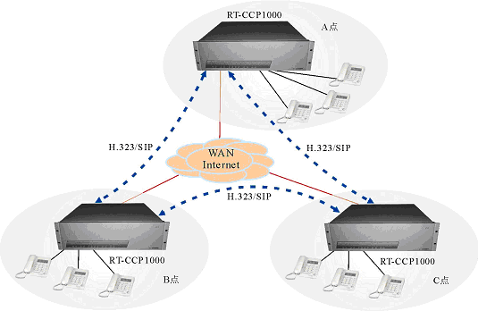 - 多個位于不同地點(diǎn)的RT-CCP1000通過廣域IP網(wǎng)互連,組成一個統(tǒng)一系統(tǒng),實(shí)現(xiàn)遠(yuǎn)程無縫通信。