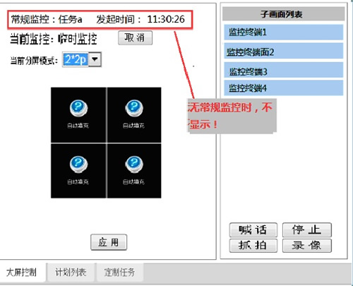 監(jiān)控計(jì)劃規(guī)定了監(jiān)控系統(tǒng)何時(shí)以何種方式在大屏上顯示多個(gè)現(xiàn)場(chǎng)的監(jiān)控畫面。監(jiān)控畫面可輪詢,可調(diào)整設(shè)置畫面分屏顯示模式;可以固定在某位置顯示某監(jiān)控畫面;可以切換到險(xiǎn)情聯(lián)動(dòng)監(jiān)控模式?梢耘c監(jiān)控畫面喊話;監(jiān)控錄像;保存畫面等功能。