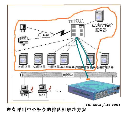 除AVAYA外,目前所有的傳統(tǒng)交換機(jī),都只是個(gè)PBX,用戶既不能編程,也沒(méi)可編程的CTI技術(shù),只承擔(dān)了系統(tǒng)中一個(gè)很小的排隊(duì)功能(ACD),該解決方案的關(guān)鍵任務(wù)仍然由語(yǔ)音卡+工控機(jī)的平臺(tái)來(lái)完成:IVR、CTI、FAX、錄音等系統(tǒng)的幾乎全部主要功能,因此無(wú)論從成本上還是技術(shù)的領(lǐng)先性、可靠性和穩(wěn)定性,可擴(kuò)展性和可維護(hù)性上,絕不是先進(jìn)的解決方案,而只是基于品牌的導(dǎo)向;而對(duì)于中小企業(yè),更多地去關(guān)心產(chǎn)品的適用性,而根本耗不起品牌。因此,從上圖可分析,傳統(tǒng)排隊(duì)機(jī)的解決方案本身很落后,性價(jià)比也很低。