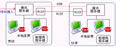 如某些城市勞動(dòng)和社保是業(yè)務(wù)分開,為共用12333接入號(hào)可采取此種方式,在呼叫首次接入時(shí)提示用戶選擇勞動(dòng)、還是社保咨詢服務(wù),如果選擇社保服務(wù)則通過DDN專線或VOIP將呼叫接入到社保的交換機(jī)中。