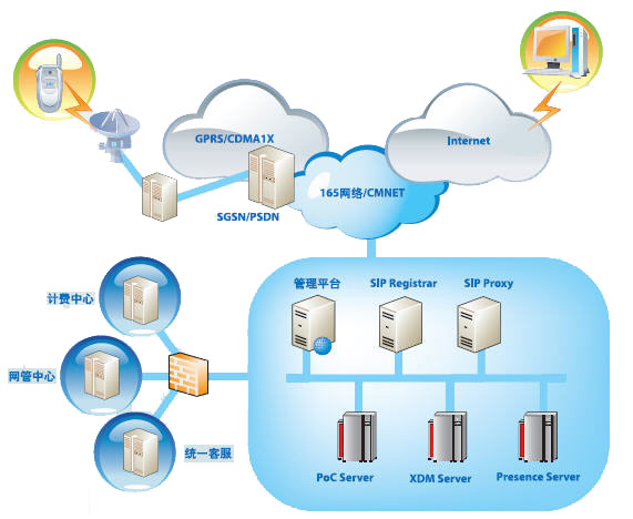 POC(Push-to-talk Over Cellular)是基于蜂窩移動通信網絡的PTT(Push To Talk)業(yè)務。POC通過半雙工VoIP技術來實現PTT,利用GPRS或CDMA1X等網絡“永遠在線”的優(yōu)勢,節(jié)省運營成本,同時為傳統(tǒng)移動用戶提供全新的業(yè)務形式。在支持GPRS/CDMA1X網絡的同時,東信北郵手機一鍵通平臺系統(tǒng)亦支持IMS網絡。