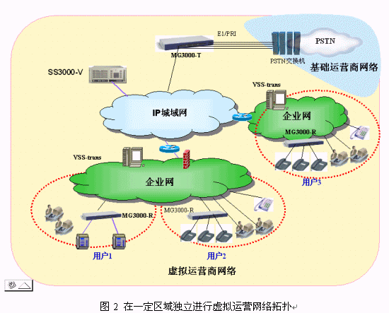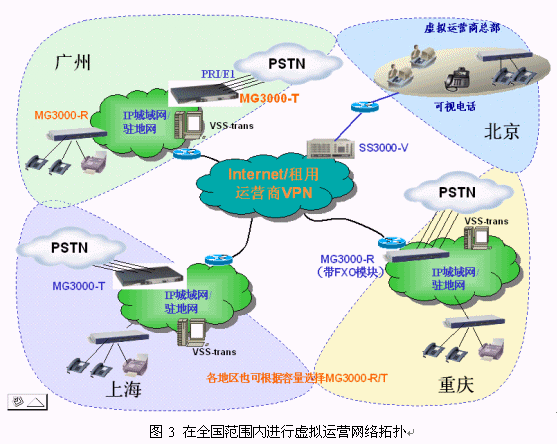 對(duì)于想在全國(guó)范圍內(nèi)運(yùn)營(yíng)的虛擬運(yùn)營(yíng)商,在總部放置一套SS3000-V,同時(shí)在有用戶群的區(qū)域的用戶網(wǎng)內(nèi)放置VSS-trans,以解決公網(wǎng)-私網(wǎng)及私網(wǎng)-私網(wǎng)之間的NAT/PAT穿越。為了解決長(zhǎng)途問(wèn)題,在各地放置MG3000-T實(shí)現(xiàn)長(zhǎng)途落地。為了保證語(yǔ)音質(zhì)量,通常虛擬運(yùn)營(yíng)商通過(guò)自己的IP網(wǎng)或租用VPN等,沒(méi)有相關(guān)資源時(shí)也可以通過(guò)Internet將各地聯(lián)系起來(lái),通過(guò)在各分部放置FXO口IAD或MG3000-T可以實(shí)現(xiàn)長(zhǎng)途零話費(fèi),利用各地網(wǎng)關(guān)相互落地,從而實(shí)現(xiàn)撥叫其他區(qū)域的外網(wǎng)用戶只需付市話費(fèi)。這樣就為虛擬運(yùn)營(yíng)提供了很好的競(jìng)爭(zhēng)基礎(chǔ),開(kāi)拓了廣闊的利潤(rùn)空間。