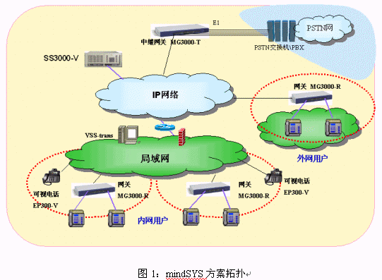 利用mindSYS平臺搭建企業(yè)內部VoIP網(wǎng)絡,需要在企業(yè)內部部署核心信令交換設備SS3000-V,各地市部署與運營商互通的中繼媒體網(wǎng)關MG3000-T;駐地側部署分布的語音終端接入設備,比如AG、RG、IP電話、視頻終端、軟電話等。網(wǎng)絡拓撲如圖1所示。