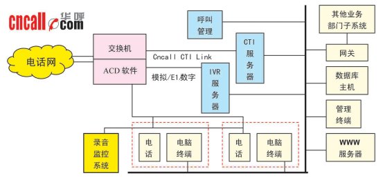 華呼(www.cncall.com)典型的基于交換機(jī)平臺(tái)廣電呼叫中心解決方案的主系統(tǒng)包括:PBX交換機(jī)平臺(tái)、計(jì)算機(jī)電話集成系統(tǒng)(CTI)、交互式語音應(yīng)答系統(tǒng)(IVR/IFR)、人工座席系統(tǒng)、電話錄音監(jiān)聽管理系統(tǒng)CCLog、呼叫中心管理系統(tǒng)CCM、數(shù)據(jù)庫應(yīng)用系統(tǒng)、WWW服務(wù)器、應(yīng)用網(wǎng)關(guān)。