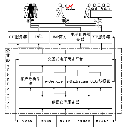 交互式電子商務(wù)平臺(tái):負(fù)責(zé)將企業(yè)內(nèi)部的系統(tǒng)和企業(yè)的電子渠道(如:WEB、電子郵件、WAP、手機(jī)短消息和呼叫中心(Call Center)等)與企業(yè)內(nèi)部的業(yè)務(wù)系統(tǒng)(如:銷售系統(tǒng)、ERP系統(tǒng))等連接起來共同為客戶提供更為有效的服務(wù)。