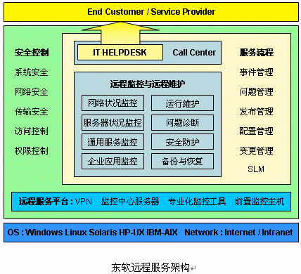 以東軟IT HELPDESK作為接入平臺(tái),結(jié)合基于VPN的遠(yuǎn)程監(jiān)控、遠(yuǎn)程維護(hù)技術(shù),遵照ITIL流程,為客戶提供及時(shí)、優(yōu)質(zhì)的服務(wù),達(dá)到降低服務(wù)成本、提高服務(wù)效率、改善客戶滿意度的目的。
