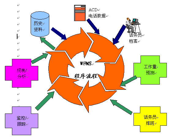 如上面所描述的WFMS流程,最初開始于歷史的電話信息、目前的ACD數(shù)據和服務代表的簡介。從這些綜合的信息,做出對工作量的預測,從而從本質上決定了配備給呼叫中心的服務代表數(shù)量。了解了服務代表的需求數(shù)量,一個適用于任何時間段的工作時間表就可以產生了,包括每天的,每周的,每月的;谶@一點,主管人就可以監(jiān)控服務代表的行為,追蹤來電,并分析不同種類的來電分組,做出應對假定情景的方案,從而產生各種各樣的報告和圖表。