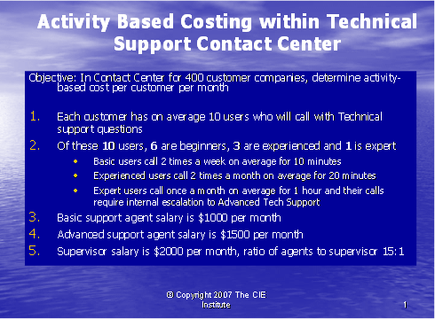 呼叫中心業(yè)務包括大量單獨的行動 — 行動成本法(ABC)使我們跟蹤那些行動以至于更清楚地了解支持一個客戶的所需事項。傳統(tǒng)上,呼叫中心成本是根據(jù)投入來衡量的:人數(shù),設備量,設施的規(guī)模。為了了解服務一個客戶所花費的成本量,呼叫中心的主管必須確定這些行動如何與該客戶相聯(lián)系的。只有做到這一點,行業(yè)才能知道來自該客戶的收入是否超出為其提供服務所產(chǎn)生的成本。如果服務的成本大于收入,那么這個客戶對于行業(yè)來說是無利可圖的,所以確定哪些客戶有利可圖和哪些客戶無利可圖是很重要的,這樣,行業(yè)才可以根據(jù)客戶定價和客戶服務策略有利地進行管理。