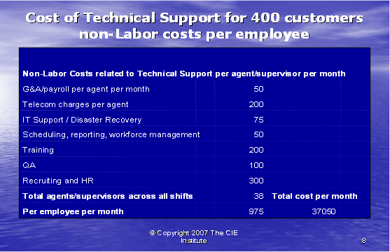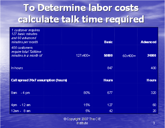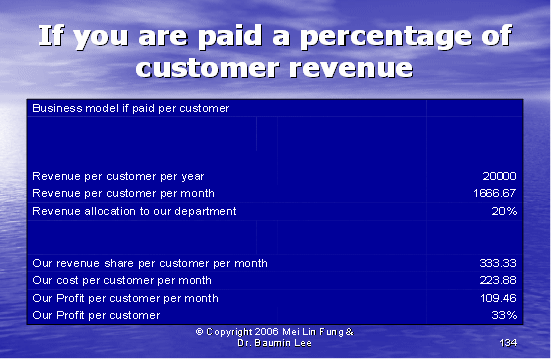 根據(jù)圖表12,我們可以算出第二種方式的利潤百分比。如果我們假設每個客戶每年的收入是20,000美元,其中分配給呼叫中心部門的收入是20%。我們每個客戶每月的收入是333.33美元,每個客戶月的成本是223.88美元(參見圖表10)。這導致我們來自每個客戶每月的利潤是109.46美元——這將產(chǎn)生33%的利潤率。