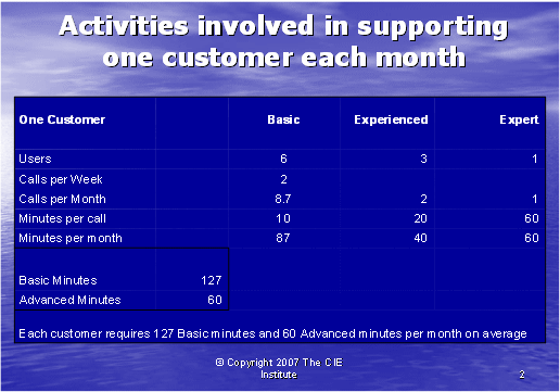 圖表1為我們提供了重要的信息,有助于我們計算一般的客戶在基礎和高級兩種技術(shù)支持中所需的技術(shù)支持的通話時長。我們需要區(qū)分這兩種技術(shù)支持,因為提供高級技術(shù)支持的座席的月薪是2000美元,比提供基礎技術(shù)支持,月薪為1000美元的座席每月所花的成本要高。那么,面臨有經(jīng)驗的客戶使用者時該怎么做呢?因為只有專業(yè)客戶使用者才能要求高級座席支持,所以他們的需要似乎可以由與初級客戶使用者打交道的基礎座席處理。