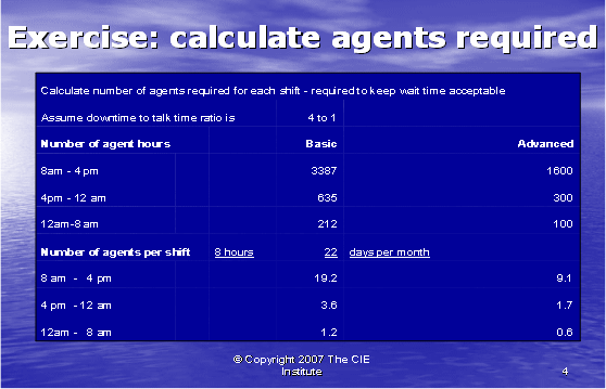我們現(xiàn)在可以轉(zhuǎn)向下一階段的運算,這一運算決定我們需要多少座席去支持400個客戶。由于技術(shù)支持呼叫中心一天24小時,一周7天進行運營,以及座席必須三班倒工作,使問題更為復雜。通過測量一天當中的話務量,我們發(fā)現(xiàn)80%的電話聚集在上午八點到下午四點的時間段,15%的電話聚集在下午四點到午夜的時間段,還有5%則在午夜到上午八點的時間段。因此,現(xiàn)在我們用該信息去計算每個排班中所需要的通話時長。表3表明了根據(jù)基礎和高級支持需要而為我們計算出的小時數(shù)。