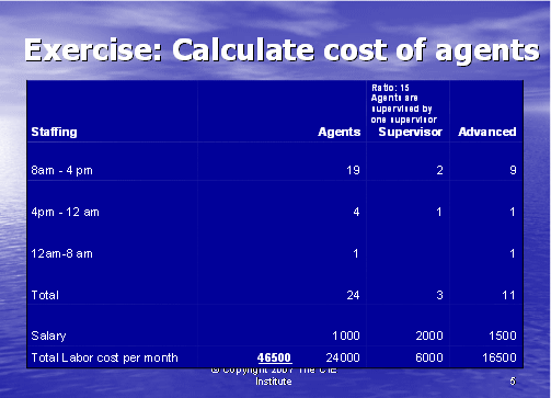 我們下一步就是計算出主管的成本。每次排班至少需要一個主管,如果這一排班的座席數(shù)要少一些,主管則也應該能夠處理一些技術(shù)支持的電話。在這個例子中,我們將假設主管擁有高級支持座席的技術(shù)技巧。在圖表5中,你將看到我們使用了圖表4所得出的座席數(shù),并假設這是每次排班話務量中所需的各種類型員工的數(shù)量:基礎,高級和主管。我們同時用圖表1中的薪資去計算座席和主管支持400個客戶的總成本。通過把每種座席單獨的成本相加(24個基礎座席,11個高級座席和3個主管),得出每月的人工成本為46,500美元。