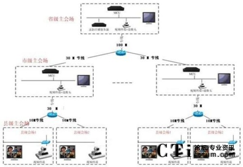 本方案整體采用基于IP網(wǎng)絡,在省、市中心機房放置MCU,通過網(wǎng)線接入核心交換網(wǎng)絡;在會議室放置視頻終端,通過郵政專網(wǎng)進行互聯(lián)。一級系統(tǒng)以省中心會議室為主會場,下屬各市會議室為分會場組成邏輯星形拓撲結(jié)構(gòu);二級系統(tǒng)以市州郵政局會議室為主會場,下屬各區(qū)縣郵政局會議室為分會場。兩級系統(tǒng)通過MCU級聯(lián)互通,形成一個樹形的拓撲結(jié)構(gòu)。系統(tǒng)主要由全視頻會議管理系統(tǒng)、純硬件MCU、純硬件1080P高清會議終端等組成,采用MCU為中心的星形結(jié)構(gòu)建立一個數(shù)字連接的、專業(yè)的視頻會議系統(tǒng)。視頻會議系統(tǒng)可由省郵政廳視頻會議中心控制,任意切換參會市、州(分中心)、縣、市、區(qū)(終端)的會議畫面。視頻會議系統(tǒng)可以指定任意參會單位發(fā)言并實現(xiàn)全省會場統(tǒng)一的畫面切換。視頻會議系統(tǒng)可實現(xiàn)省郵政局集中控制與管理,易于使用,能進行遠程管理、遠程維護、可降低維護成本。通過授權(quán),各級單位可自行組織、控制會議,方便各級單位的使用。