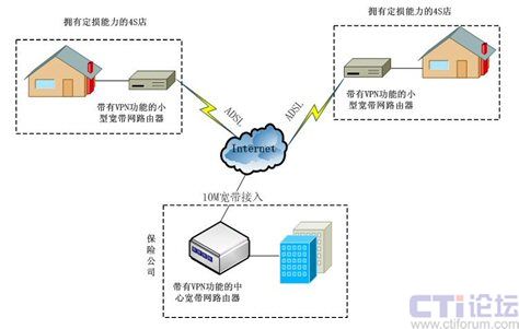 在保險公司數(shù)據(jù)交換控制中心配置一臺具有VPN功能的中心寬帶網(wǎng)路由器,每條ADSL配置一個具有VPN功能的小型寬帶網(wǎng)路由器,并通過設置路由器即可成功建立起VPN網(wǎng)絡。這種網(wǎng)絡結構不但有效的節(jié)約了成本,而且日后系統(tǒng)的擴容的成本也非常的低,每增加一個點只需要申請一條ADSL就可以了。