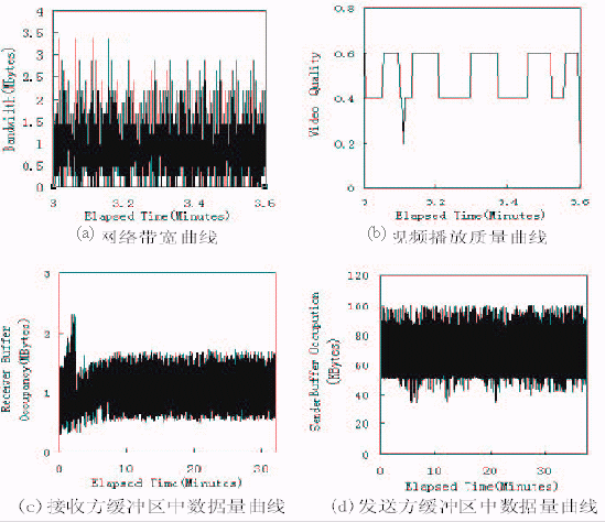 圖3給出了在劇烈的帶寬變化情況下,應用該技術的視頻點播系統(tǒng)所達到的性能。在圖3中,(a)表示所使用的帶寬情況;(b)表示客戶端得到的視頻播放質(zhì)量;(c)和(d)分別表示在播放過程中接收緩沖區(qū)和發(fā)送緩沖區(qū)中的數(shù)據(jù)量情況。對比圖3(a)(b)可以看出,在網(wǎng)絡帶寬劇烈變化的情況下,視頻播放質(zhì)量的變化很平緩。由圖3(c)知,接收方緩沖區(qū)沒有發(fā)生上溢或下溢,這表明客戶始終能享受到連續(xù)的視頻播放,沒有出現(xiàn)播放卡殼;也沒有出現(xiàn)因為緩沖區(qū)上溢而丟失從網(wǎng)絡傳過來的數(shù)據(jù)。圖3(d)則表明發(fā)送緩沖區(qū)始終在80k字節(jié)左右,沒有發(fā)生下溢,說明數(shù)據(jù)發(fā)送模塊始終有數(shù)據(jù)可發(fā),即網(wǎng)絡帶寬得到了充分利用。