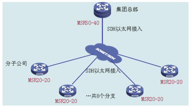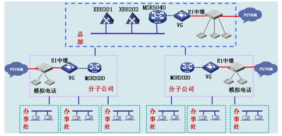 集團(tuán)總部和分子公司部署H3C公司的VG80-20作為語(yǔ)音網(wǎng)關(guān),VG 80-20提供2個(gè)E1語(yǔ)音接口用于接連接程控電話交換機(jī)PBX的E1中繼線,通過以太網(wǎng)口連接到IP網(wǎng)中。