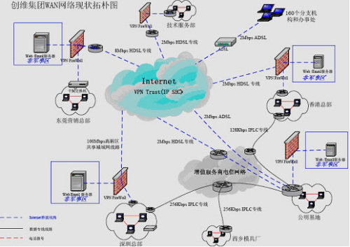 ·整個網(wǎng)絡(luò)連通性很差:隨著公司業(yè)務(wù)發(fā)展和規(guī)模擴(kuò)大,現(xiàn)在整個集團(tuán)除總部外還包括13個產(chǎn)業(yè)公司和全國160個分支機(jī)構(gòu),分布在以深圳為中心的全國各個地方,目前各產(chǎn)業(yè)公司之間的網(wǎng)絡(luò)連接除深圳總部、香港、公明基地和西鄉(xiāng)模具廠四地之間是通過窄帶IPLC專線連接外,其他各地均通過Internet公網(wǎng)連接,沒有構(gòu)成統(tǒng)一的企業(yè)內(nèi)部網(wǎng)絡(luò)互連。