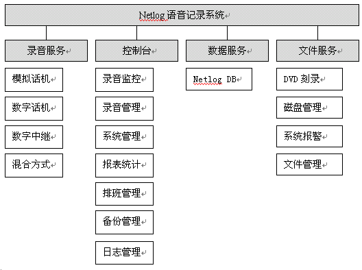 NetLog語音記錄系統(tǒng)采用基于分布式、多層控制管理體系的設計思想,將電話線路與內部網(wǎng)絡有效地結合在一起,形成一套完整的語音錄制、管理系統(tǒng)。采用目前先進的C/S模型,能更方便、快捷地實現(xiàn)控制臺對網(wǎng)絡內所有記錄服務的狀態(tài)監(jiān)視,記錄查詢,操作控制等,采用統(tǒng)一的管理化機制,使文件的管理和備份更簡潔。