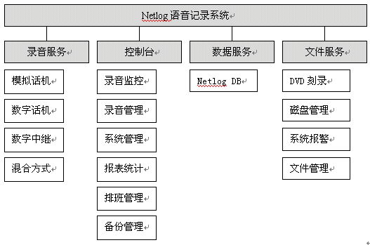 NetLog語(yǔ)音記錄系統(tǒng)采用基于分布式、多層控制管理體系的設(shè)計(jì)思想,將電話線路與內(nèi)部網(wǎng)絡(luò)有效地結(jié)合在一起,形成一套完整的語(yǔ)音記錄、管理系統(tǒng)。NetLog系統(tǒng)包括數(shù)據(jù)服務(wù)、文件服務(wù)、記錄服務(wù)、控制臺(tái);