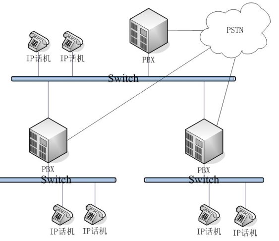 - 普通網(wǎng)絡(luò)結(jié)構(gòu):適用用于中型企業(yè)。在不同地域有公司分部,各分部之間通訊需要通過PSTN,每個分部都有自己的PBX。相對于每個分部而言,采用的是簡單網(wǎng)絡(luò)結(jié)構(gòu)。