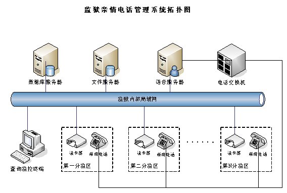 親情電話管理系統(tǒng)在系統(tǒng)設(shè)計中充分考慮監(jiān)獄的需求與特點,不但包含了一般親情電話錄音所需的全部功能,而且還融合了獄政管理的功能,整個系統(tǒng)采用集中式方式,在中心機房部署一套親情電話錄音服務(wù)器,各個監(jiān)區(qū)監(jiān)控系統(tǒng)利用監(jiān)獄內(nèi)部的局域網(wǎng)聯(lián)結(jié)成一個整體,形成一個能監(jiān)控監(jiān)獄親情電話的全網(wǎng)。這樣即可以在每個監(jiān)區(qū)監(jiān)聽,也可以在監(jiān)獄內(nèi)部網(wǎng)的任何地方對親情電話進行全程監(jiān)視。該系統(tǒng)能夠完全滿足目前監(jiān)獄的需求,產(chǎn)品性價比遠遠高于市場上其他同類產(chǎn)品。