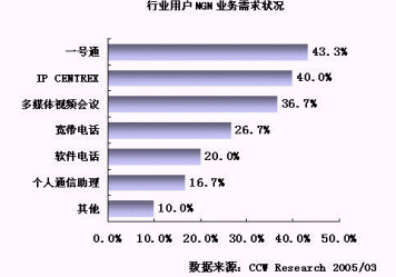 NGN 成為電信運(yùn)營(yíng)商滿足用戶需求的有力武器。不同的行業(yè)用戶對(duì)基于 NGN 推出的電信業(yè)務(wù)表現(xiàn)出了較大的需求差異,例如: IT通信、物流和服務(wù)業(yè)對(duì) IP CENTREX 、多媒體視頻會(huì)議和寬帶電話等業(yè)務(wù)比較感興趣,而政府用戶對(duì)一號(hào)通等業(yè)務(wù)比較感興趣。不同行業(yè)對(duì)業(yè)務(wù)需求具有差異性,這就要求運(yùn)營(yíng)商基于 NGN 平臺(tái)開發(fā)的業(yè)務(wù)要有更大的靈活性,要有突出用戶通信需求的整體解決方案,要能滿足用戶的個(gè)性化需求。