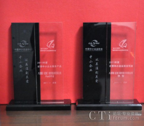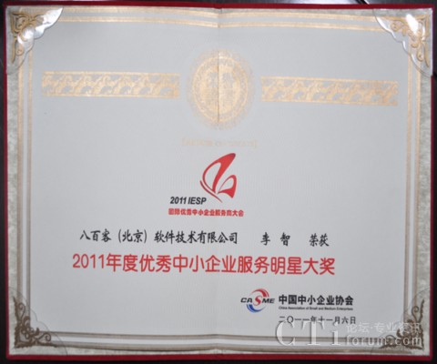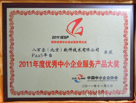作為國內首家SaaS廠商,八百客積極推動云計算在中小企業(yè)中的宣傳與運用。2006年,八百客在國內率先推出管理自動化開發(fā)平臺800APP, 它擴展了按需服務,并實現(xiàn)了客戶可根據(jù)需要自定制應用程序,成為了改變應用程序開發(fā)的一個新途徑。為表彰八百客在中小企業(yè)信息化中做出的杰出貢獻,本次大會特別為八百客頒發(fā)了“2011年度優(yōu)秀中小企業(yè)服務產品大獎”,此外還授予八百客總經理李智 “2011年度優(yōu)秀中小企業(yè)服務明星大獎”。
