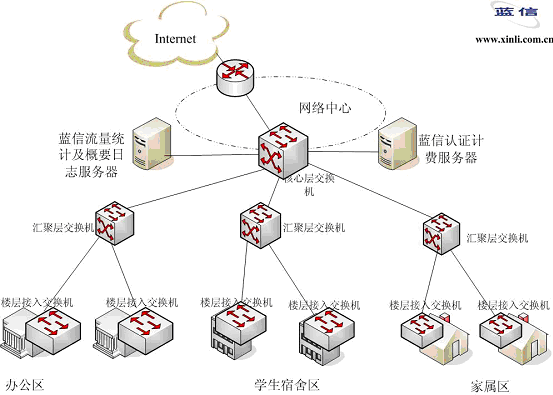 在網(wǎng)絡(luò)中心機(jī)房部署“藍(lán)信認(rèn)證計(jì)費(fèi)系統(tǒng)”,藍(lán)信認(rèn)證計(jì)費(fèi)系統(tǒng)除支持標(biāo)準(zhǔn)的RADIUS協(xié)議外,還支持領(lǐng)先的802.1x協(xié)議,通過(guò)與各接入層交換機(jī)的配合,實(shí)現(xiàn)了認(rèn)證管理功能。通過(guò)綁定帳號(hào)、IP、MAC地址等15元素,真正保證只有合法用戶才能通過(guò)認(rèn)證;對(duì)用戶進(jìn)行分級(jí)權(quán)限管理,可按信用度等級(jí)對(duì)用戶進(jìn)行劃分,方便了用戶的管理。此外,在網(wǎng)絡(luò)出口處部署藍(lán)信流量統(tǒng)計(jì)工具,通過(guò)與藍(lán)信認(rèn)證計(jì)費(fèi)系統(tǒng)的配合,實(shí)現(xiàn)對(duì)用戶按流量來(lái)計(jì)費(fèi),可以把用戶訪問(wèn)流量按校內(nèi)校外、國(guó)內(nèi)國(guó)際來(lái)區(qū)別對(duì)待,并設(shè)置不同的費(fèi)率。同時(shí),還部署了藍(lán)信概要日志系統(tǒng),有效記錄了用戶的上網(wǎng)信息,并提供人性化的web客戶端,方便管理者進(jìn)行事后查詢(xún),有效的控制了網(wǎng)絡(luò)的安全性。