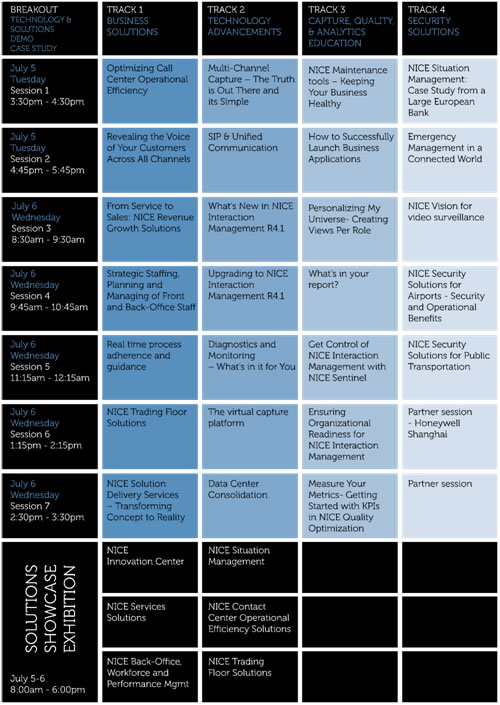 Interactions 2011亞太區(qū)年度客戶大會。NICE聯(lián)同NICE 用戶社群,將匯集300多名行業(yè)精英、政府領(lǐng)導、電信、銀行金融機構(gòu)、公共安全以及安防業(yè)等不同范疇的業(yè)界專家,為與會人員提供一個高質(zhì)量的學習環(huán)境和交流平臺。