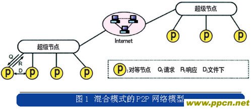 Skype是P2P技術(shù)演進到混合模式后的典型應用,它結(jié)合了集中式和分布式的特點,在網(wǎng)絡的邊緣節(jié)點采用集中式的網(wǎng)絡結(jié)構(gòu),而在超級節(jié)點之間采用分布式的網(wǎng)絡結(jié)構(gòu),混合模式的P2P網(wǎng)絡模型如圖1所示。