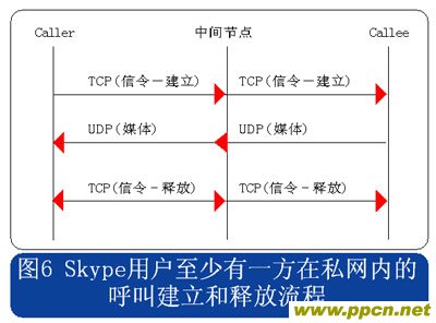 從上述流程圖可見,Skype的呼叫信令都采用TCP封裝,而媒體流則使用UDP封裝,當有任何一方用戶位于限制UDP包的防火墻內(nèi)時,媒體流就會采用TCP封裝。另外當Skype用戶至少有一方位于私網(wǎng)內(nèi)時,所有的信令和媒體消息都經(jīng)過一個或多個中間節(jié)點轉(zhuǎn)發(fā)。此時無需擔心用戶通話的媒體流因為經(jīng)過中間節(jié)點轉(zhuǎn)發(fā)而被竊聽,因為Skype采用了對消息進行端到端加密的機制。