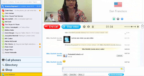 顯著的一個大改變是,軟件界面變成了全屏,而視頻窗口又占據(jù)了絕大部分版面。在視頻中還有“畫中畫”的功能,小的畫面可以任意移動。可以說skype從一部網(wǎng)絡(luò)電話,變成了一部網(wǎng)絡(luò)可視電話。或者,好像感覺是在視頻聊天室中一樣。