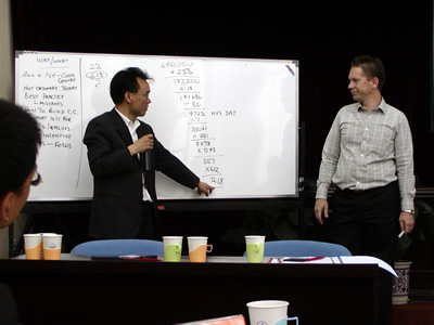 公開課在Simon Kriss先生詼諧的講課風(fēng)格的引導(dǎo)下自始至終在輕松、愉快又不失專業(yè)深度的氛圍中進(jìn)行著,而Simon Kriss先生以呼叫中心運(yùn)營管理的高效率為主題,從呼叫中心的環(huán)境布局、預(yù)測管理、人力資源管理、效率管理到專業(yè)報(bào)告形式等知識(shí)點(diǎn)上做了專業(yè)深入的講解。尤其在人力資源管理和效率管理方法的傳授時(shí)引發(fā)了全體學(xué)員極大的興趣和反應(yīng),例如:就人員附著度的定義及操作問題學(xué)員同講師展開了多倫次的討論。而Simon