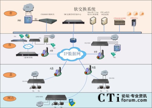 - 地州市分集團(tuán)放置的二級(jí)軟交換系統(tǒng),作為其管轄的縣(市)級(jí)分集團(tuán)和營(yíng)業(yè)廳的呼叫控制中心,管理和控制其管轄地區(qū)的IP電話終端設(shè)備。