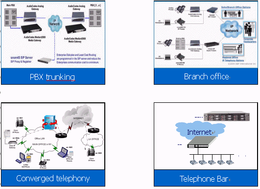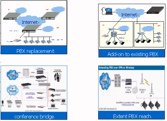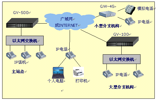 - 分公司:選用一臺4口網關設備,接入到互聯網絡,通過公共的IP交換中心建立起呼叫連接,實現打電話的功能。模擬了通過網關設備接入PBX(電話程控交換機),如果其它分部也要接入PBX,與此情況類似。(詳見后面的"撥號示例")