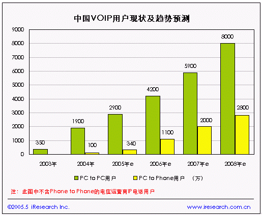 根據(jù)信息產(chǎn)業(yè)部的統(tǒng)計,2005年上半年IP通話時長(去話)達到644.1億分鐘,同比增長17.4%,據(jù)iResearch預(yù)測,2008年中國的PC to Phone的VoIP電話用戶將達到2800萬戶(如圖1)。2004-2005年,中國IP電話業(yè)務(wù)保持較高速度增長,但增長率已經(jīng)有所下降,因此中國IP電話業(yè)務(wù)處于擴張期?梢灶A(yù)見IP電話業(yè)務(wù)仍將保持增長,但增長率將持續(xù)下降。中國VoIP市場的特點可以歸納為:使用VoIP技術(shù)的應(yīng)用環(huán)境正在逐步成熟,尚需要迎接質(zhì)量、網(wǎng)絡(luò)帶寬、安全等方面的挑戰(zhàn)。