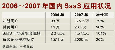 SaaS在中國(guó)正步入一個(gè)快速發(fā)展的時(shí)期。計(jì)世資訊調(diào)查數(shù)據(jù)顯示,2007年國(guó)內(nèi)SaaS市場(chǎng)在諸多積極因素的刺激下快速發(fā)展,用戶的投資額度和付費(fèi)用戶數(shù)快速增長(zhǎng),使得企業(yè)用戶在在線管理服務(wù)的投入上有較快的增長(zhǎng)。2007年企業(yè)用戶在SaaS上的平均投資額度比2006年增長(zhǎng)了約26%。2007年管理型SaaS應(yīng)用的總投資規(guī)模為4.5億元,但與2007年管理軟件市場(chǎng)整體規(guī)模248億元比,目前在線管理服務(wù)市場(chǎng)規(guī)模仍然相當(dāng)小。