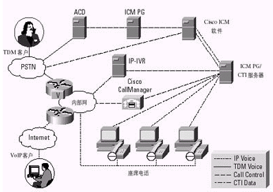 通過一個(gè)容納了ACD、IVR、Web和電子郵件服務(wù)器、桌面應(yīng)用以及其他內(nèi)容的計(jì)劃,Cisco ICM軟件使公司能夠利用Internet或PSTN實(shí)現(xiàn)與客戶的交互。