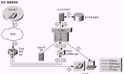 注意2:這一樣本語音/數(shù)據(jù)流描述了一個(gè)單地點(diǎn)IPCC實(shí)現(xiàn)。另外,可以將IPCC集成到一個(gè)多地點(diǎn)聯(lián)絡(luò)中心,并獲得ICM軟件所提供的可貫穿整個(gè)企業(yè)的、網(wǎng)絡(luò)級(jí)的路由預(yù)選功能所能帶來的好處。