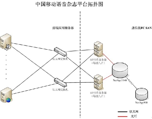 其中,NetApp FAS3140 配有 6 個(gè) 450GB 的 FC 磁盤(pán)和兩個(gè) 300GB FC 磁盤(pán),裸容量為 46TB,用于運(yùn)行中國(guó)移動(dòng)的語(yǔ)音雜志業(yè)務(wù),采用 Socket 連接。NetApp FAS2050 則內(nèi)置有 12 塊1TB SATA 磁盤(pán),裸容量為 12TB,主要用于測(cè)試高陽(yáng)公司 Oracle 數(shù)據(jù)庫(kù)和網(wǎng)站應(yīng)用等。