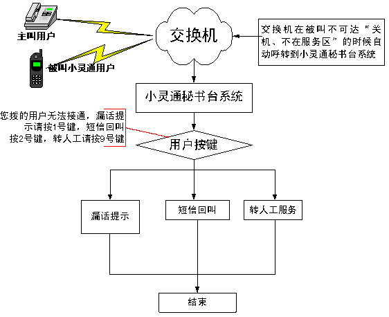當主叫用戶撥打被叫小靈通用戶,而被叫小靈通用戶處于不可達(關機、忙、不在服務區(qū))狀態(tài)時,該呼叫自動轉(zhuǎn)入轉(zhuǎn)到小靈通秘書臺系統(tǒng)后,用戶選擇短信回叫,系統(tǒng)在被叫小靈通用戶空閑后,會發(fā)送短信通知主叫用戶,被叫已經(jīng)恢復狀態(tài),可以呼叫。