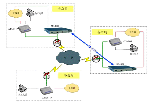 由于用戶數(shù)量較大,我們建議采取分級管理方式,利用我們Anta科技(北京)有限公司Simplicity 系列IP-PBX產(chǎn)品的靈活性,在每個市局放置一臺ME-1000型號的IP-PBX,管理市局及下屬縣區(qū)局的電話系統(tǒng);省總局放置一臺ME-1000,管理總局電話系統(tǒng);同時各市局的ME-1000向總局注冊,形成IP中繼連接,組成全省互通的IP電話管理系統(tǒng)。在終端方面,我們建議采用單端口的ATA-811P桌面型語音網(wǎng)關連接話機,該網(wǎng)關通過向IP-PBX注冊,將所有模擬話機連接到VOIP系統(tǒng)中來。