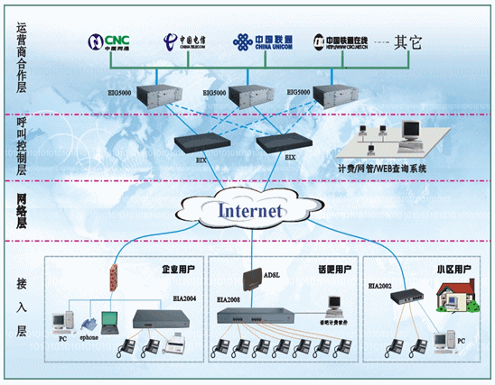 - 在運(yùn)營商合作層,EIG5000系列是集軟交換為一體的數(shù)字中繼網(wǎng)關(guān),與傳統(tǒng)運(yùn)營方案比減少了設(shè)備投入,更加保證可靠方便的應(yīng)用,EIG5000系列可以配合網(wǎng)管系統(tǒng)、計費(fèi)系統(tǒng)、WEB管理系統(tǒng)組成整個完整的局端運(yùn)營系統(tǒng),而增加EIX7100設(shè)備可以更好的冗余備份,使整個運(yùn)營平臺更加穩(wěn)定。EIA設(shè)備根據(jù)客戶類型和需求配置相應(yīng)的設(shè)備;