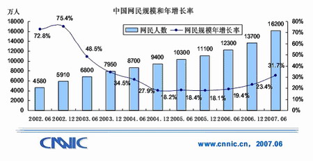 1、上網(wǎng)人數(shù)持續(xù)發(fā)展,截止到2007年6月底,已達1.62億。手機上網(wǎng)人數(shù)已達4430萬,而上一年這個數(shù)字為1700多萬。