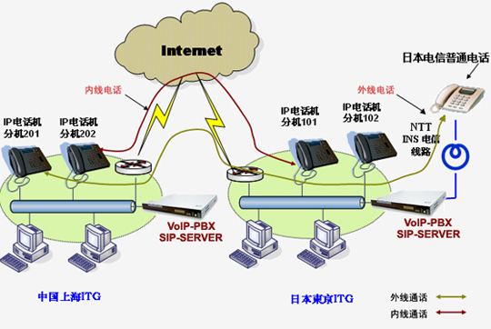 上海愛吉研發(fā)的VoIP-PBX軟交換系統(tǒng)已經(jīng)成功地在上海愛吉和日本愛吉以及日本的客戶間實(shí)施。目前應(yīng)用上海愛吉生產(chǎn)的VoIP-PBX產(chǎn)品,可以實(shí)現(xiàn)從上海愛吉的任意IP電話機(jī)撥打內(nèi)部分機(jī)號(hào),例如:101,成功實(shí)現(xiàn)從Internet互聯(lián)網(wǎng)接通位于日本東京的日本ITG或日本OKI公司的IP電話機(jī),而不產(chǎn)生任何的電信費(fèi)用。另外,目前通過日本的NTTINS 交換機(jī),還實(shí)現(xiàn)了從上海愛吉的IP電話機(jī)可以撥打日本方面的任意普通電話,即日本電信范圍內(nèi)的任意普通電話,而僅僅產(chǎn)生從日本ITG到日本其它地方的短途或國內(nèi)長(zhǎng)途費(fèi)用,而沒有上海到日本的國際長(zhǎng)途費(fèi)用。具體的網(wǎng)絡(luò)應(yīng)用圖如下所示: