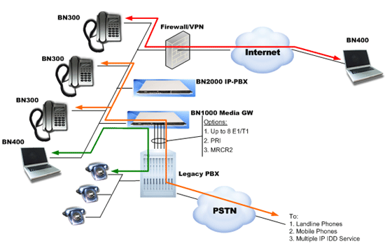 IP-PBX具有強(qiáng)大的動態(tài)路由選擇功能。將BN2000IP-PBX與BN1000網(wǎng)關(guān)配合使用,傳統(tǒng)PBX管轄下的每個(gè)模擬電話就會變身為BN300