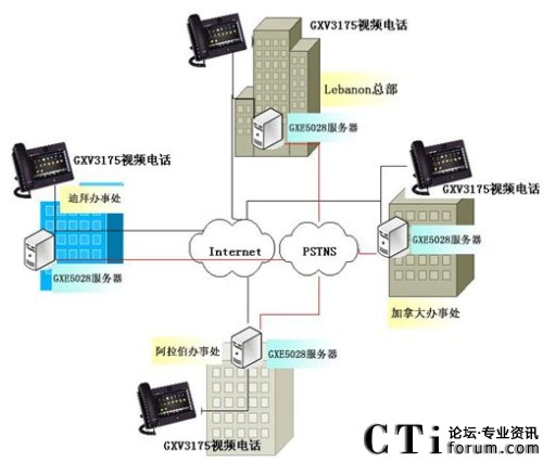 在Tabbara公司的全球四個辦事處分別安裝潮流網(wǎng)絡(luò)的GXE5028 IPPBX服務(wù)器或者其他的SIP Sever通信平臺,GXE5028 IP PBX支持語音信箱,郵件和其他通信功能應(yīng)用,每一臺GXE5028最大限度地支持分布全球辦事處的所有通信賬號同時連接到同一網(wǎng)絡(luò)中,終端連接IP電話,IP視頻電話以及IP視頻監(jiān)控攝像機作為語音/數(shù)據(jù)的輸入輸出,當(dāng)然IP PBX也可通過網(wǎng)絡(luò)連接到VoIP服務(wù)器中間位置的SIP中繼。潮流網(wǎng)絡(luò)的GXV3175多媒體觸摸屏視頻電話,支持標(biāo)準(zhǔn)的SIP協(xié)議,先進(jìn)的H.264/H.263/H.263+視頻壓縮標(biāo)準(zhǔn),寬大的7寸彩色觸摸顯示屏實現(xiàn)溝通面對面的零距離交流,以及撥打網(wǎng)絡(luò)攝像機觀看監(jiān)控現(xiàn)場。潮流網(wǎng)絡(luò)的GXV3662_HD高清防暴半球IP攝像機和GXV3651_HD IP攝像機,分別安裝在辦事處關(guān)鍵位置,365天,每周24*7個小時進(jìn)行實時監(jiān)控,作為企業(yè)財產(chǎn)和人員安全的保障。方案中,各分支機構(gòu)之間通話免費,撥打分支機構(gòu)所在地其他電話按市話費算,出差人員使用IP電話與公司內(nèi)部通話免費。